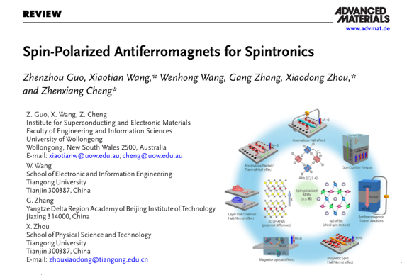 近期,国际材料科学著名期刊《Advanced Materials》(影响因子27.4)在线发表了题为《Spin-Polarized Antiferromagnets for Spintronics》的综述论文,系统总结了自旋极化反铁磁材料在自旋电子学领域的前沿进展与未来发展方向。该论文由偷拍美女 王文洪教授团队与澳大利亚伍伦贡大学程振祥教授团队联合完成,其中我院青年教师周小东特聘副研究员与伍伦贡大学王啸天、程振祥教授为共同通讯作者。该研究工作得到了国家重点研发计划物态调控专项“强自旋轨道耦合反铁磁材料物态调控及原型器件”(2022YFA1402600)等项目的有力支持。论文链接://doi.org/10.1002/adma.202505779。